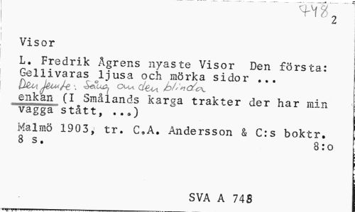 //// ^ 2 //// Visor //// L. Fredrik Ågrens nyaste Visor Den första: Gellivaras ljusa och mörka sidor ... //// (j&i^t-e. \ Sau^ ou^ cl^ JD/z^c/ca. enkan (I Smålands karga trakter der har min vagga stått, ...) //// Malmö 1903, tr. C,A. Andersson & C:s boktr. 3 s. 8:o //// SVA A 748 ////