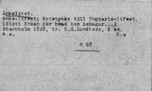 //// Änkelivet. //// Kriice-iimt; Motstycke till Ungkarls-1 ifwet. (Blott Inkan gör hwad hon behagar...) Stockholm 1828, tr. G.Lundberg, 2 ex. 43. 8;o //// G 67 ////