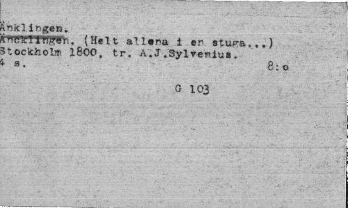 //// inkl ingen. //// iflffETrWffgh. (Helt allena i en stup-a...) Stockholm 1800, tr. A.J.Sylrenius. ; s. 8:0 //// Gr 103 ////