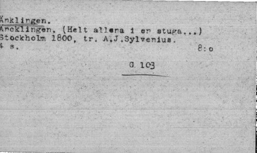 //// Cnitl irgen. //// Veklingen. (Helt allena i en stuga...) //// Stockholm 1800. tr. A.J .Sylvenlue. //// i. a. e:o //// G 103 ////