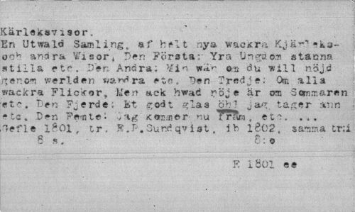 //// lärleksv i sor, //// En Utwalö Samling, af helt nya wackJra Kjän^-ks-och andra Wiaor, Der: Förstår Yra tingat©» stanna stilla etc. Der. Andra: V'i i w.*> 0.2 du will nöj.d genom werlden »arv» ra ete, Den Tredje; Om alla wackra Flickor, Men ack hwad nöje är om - -Sommaren etc, Den Pjerde; 1st god:, glas öv;jag. tager atm etc. Den Femte: icsiaer nu Tram, eto, .,. //// "refle 1801 r tr. S.P.Sunfiqviat, ib 1602, 3amma tr;i 8 s , t: o //// E 1801 ee ////