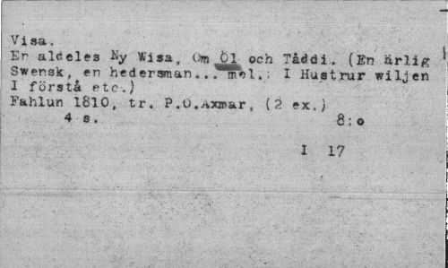 //// Visa. //// Er aldeles % Wisa, Om öl och Tåddi. (En ärlig Swensk, en hederaman.. ~m>l,: I Hustrur wiljen I förstå etc.) //// Fahlun 1810, tr. P.U.Axmar, [2 ex.) //// 4 s. 8;o //// 1 17 ////