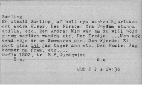//// Samling //// En utwaJd Samling, af helt nya vackra Kjärltke-•cch andra Wisor, Den Första: Yra Ungdom starna stilla, etc. Den Andra: Min wän om du wi11 nöjd genom werlden wandra etc. Der Tredje" ...Men ack hwad nöje är om Sommaren etr*. Den Fjerde: Et g o dt glas Ohl jag tager ann etc. Den Femte; Jag kommer nu fram, etc... Gefle 1802, tr. K.?.Jundqwist //// Sa. 8: o //// UUB Z P s 24:36 ////