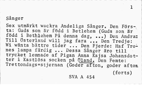 //// 1 //// Sånger //// Sex utmärkt wackra Andeliga Sånger» Den Första: Guds son är född i Betlehem (Guds son är född i Bethlehem På denna dag, ...) Den Andråt Till österland will jag fara ... Den Tredje: Wi wänta bättre tider ... Den Fjerde: Haf Tro-nes lampa färdig ... Dessa Sånger äro till trycket lemnade af Pigan Anna Kajsa Johansdotter i Kastlösa socken på Öland. Den Femte: Trettondags=stjernan (Göder afton, göder aftos //// (forts) //// SVA A 454 ////
