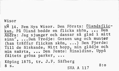 //// Wisor //// N- 14. Fem Nya Wisor. Den Första: ölandsflic-kan. På Öland bodde en flicka skön, ... Den Andra: Jag sjunger och dansar så glad i mitt sinn", ...Den Tredje: Gossen ung och munter (han träffar flickan skön, ...) Den Fjerde: Till de älskande. Mitt hopp, min glädje och min smärta, ... Den Femte: Rinaldino. Uppå fältets gröna parker, ... //// Köping 1875, tr. J.F. Säfberg //// 8 s. 8:o //// SVA A 117 ////