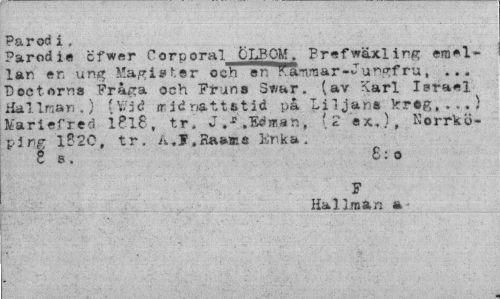 //// Parodi, //// Parodis cfw«r Corporal fcLBGM,. Br*fwäxling emellan er ung Magister och en ^.a^ar-^u^fru, ... "Doctorns Fraga och Fruns Swar. (av Karl Ie>ra*l Hallman .) (Y/id ir id nattetid på Liljans kreg, ...) Mariefred lPl8, tr. J Edman, {* ex.), Norrköping 1?20, tr. A.f.Ra»)r.a En k a . //// t s . £ : o //// F //// Hallman a ////