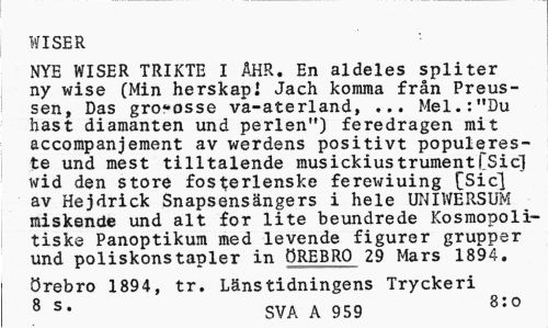 //// WISER //// NYE WISER TRIKTE I ÅHR. En aldeles spliter ny wise (Min herskapl Jach komma från Preussen, Das gro*osse va-aterland, ... Mel.:"Du hast diamanten und perlen") feredragen mit accompanjement av werdens positivt populeres-te und mest tilltalende musickiustrument[Sicj wid den store fosi;erlenske ferewiuing [Sic] av Hejdrick Snapsensängers i hele UNIWERSUM miskende und alt for lite beundrede Kosmopoli-tiske Panoptikum med levende figurer grupper und poliskonstapler in ÖREBRO 29 Mars 1894. //// Örebro 1894, tr. Länstidningens Tryckeri //// 8 s* SVA A 959 8:0 ////