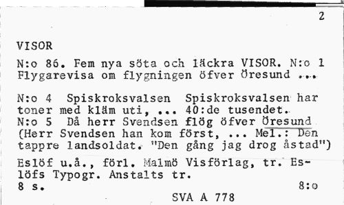 //// 2 //// VISOR //// N:o 85. Fem nya söta och läckra VISOR. N:o 1 Flygarevisa om flygningen öfver Öresund //// N:o 4 Spiskroksvalsen Spiskroksvalsen har toner med kläm uti, ... 40:de tusendet. N:o 5 Då herr Svenåsen flög öfver Öresund (Herr Svendsen han kom först, ... Mel".: Den tappre landsoldat. "Den gång jag drog åstad") //// Eslöf u.å., förl. Malmö Visförlag, tr. Es-löfs Tynogr. Anstalts tr. //// 8 s. 8:o //// SVA A 778 ////