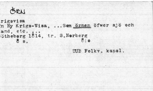 //// rigsvi sa //// n Ny Krigs-?/isa, . ..Sm juafiB, öfwer sjö och //// and, etc» ... //// ötbeborg 1814, tr. S.Norberg 8 s. 8:0 //// UUB Folkv. kapsl. ////