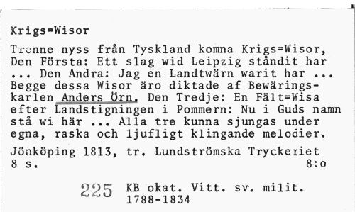 //// Krigs=Wisor //// Trenne nyss från Tyskland komna Krigs=Wisor, Den Första: Ett slag wid Leipzig ståndit har ... Den Andra: Jag en Landtwärn warit har ... Begge dessa Wisor äro diktade af Bewärings-karlen Anders örn. Den Tredje: En Fält=Wisa efter Landstigningen i Pommern; Nu i Guds namn stå wi här ... Alla tre kunna sjungas under egna, raska och ljufligt klingande melodier. //// Jönköping 1813, tr. Lundströmska Tryckeriet 8 s. 8:0 //// KB okat. Vitt. sv. milit. 1788-1834 ////
