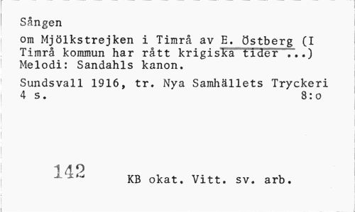 //// Sången //// om Mjölkstrejken i Timrå av E. Östberg (I Timrå kommun har rått krigiska tider T..) Melodi: Sandahls kanon. //// Sundsvall 1916, tr. Nya Samhällets Tryckeri 4 s. 8:0 //// ' KB okat. Vitt. sv. arb. ////