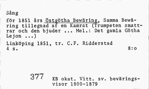 //// Sång //// för 1851 års östgötha Bewäring, Samma Bewä-ring tillegnad af en Kamrat (Trumpeten smattrar och den bjuder ... Mel.: Det gamla Götha Lejon .,.) //// Linköping 1851, tr. C.F. Ridderstad 4 s. 8:o //// 3 77 j^g okat. Vitt. sv. bevärings-visor 1800-1879 ////