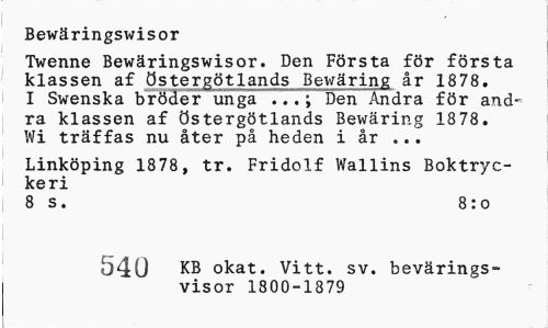 //// Bewäringswisor //// Twenne Bewäringswisor. Den Första för första klassen af Östergötlands Bewäring år 1878. I Swenska bröder unga ...; Den Andra för and-ra klassen af Östergötlands Bewäring 1878. Wi träffas nu åter på heden i år ... //// Linköping 1878, tr. Fridolf Wallins Boktryckeri //// 8 s. 8 :o //// 540 okat. Vitt. sv. bevärings-visor 1800-1879 ////