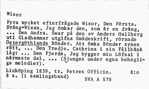 //// Beväringsvisor //// Fyra mycket efterfrågade Wisor, Den Första. DrängaWisan, Jag ömkar den, som är en dräng, ... Den Andra» Swar på den av Anders Hallberg uti Gladhammar utgifna Smädeskrift, rörande östergöthlands Bönder. Att ömka Bönder synes rätt, ... Den Tredje. Cathrina i sin Fållbänk låg: Den Fjerde. Jag bygger min Löfsal i närmaste dal, ... (Sjunges under egna behagliga melodier), //// Linköping 1839, tr. Petres Officin. 8:0 //// 8 s. (i samlingsband) gVA A 570 ////