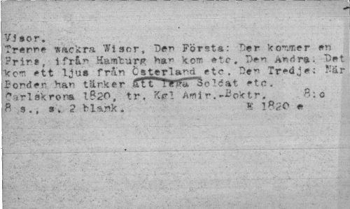 //// Vj »or. //// Trenre * ack ra Wiscr, '"D#r> Första: Der kommer en ?rit.*, i frå.n Hamburg ha*1 kom etc, Den Andra- Det kem ett ljus från tsterland etc. Tredje: ?-är //// Ponden han tär.ker ä"l"t...I"S^a, Soldat *tc. //// Carl skröna 1020, tr. KrI Amir.-Bofctr„ 8:0 //// fi 3., a; 2 blank? K 1820 * ////