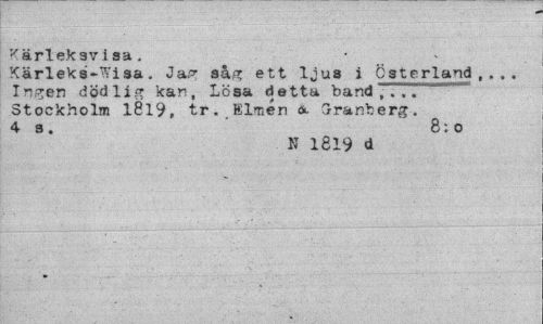 //// Kärlekavisa. //// Kärleks-Wisa. Jag såg ett ljus i Österland, . . . Ingen dödlig kan, Lösa detta band,.,. Stockholm 1819, tr. limen <st Oranberg. 4- 3 . 8:0 //// N 1819 d ////