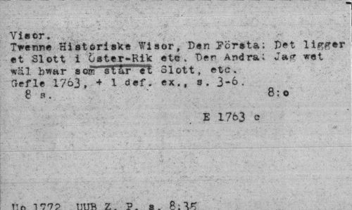 //// Vin or. //// TVerme Historleks Wisor, Den Första; pet ligger et Slott i öster-Rik etc. Der Andra: Jag wet wäl b*?ar so®" står et Slott, etc. (refle 1763, + 1 def. ex., g. 3-6. //// 8 s. 8:o //// E 1763 c //// t r - lfni Titm rt n _ O.lf ////