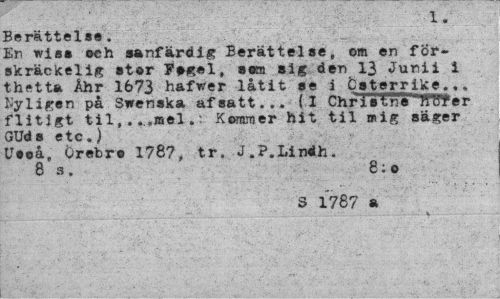 //// • . .;'.: w V ... . • 1. //// Berättelse. _ //// En wis® eeh sanfärdig Berättelse, om en för-skräckelig ster Fegel, sem sig den 13 Junii i thetta Åhr 1673 hafwer låtit se i Österrike... Nyligen på Svenska af satt... {I Chri"et"n'e JWfer flitigt til,.. .»el.: Kommer hit til mig säger GUds etc.) //// Ueeå, Örebro 1787, tr. J.P.Lindh. //// 8 s. 8: o //// S 1787 a ////