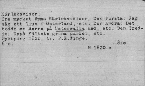 //// Kär lekav i 3 or . //// Tre mycKet ömma Kärl eks-V» i 3 or, Den Första: Jag såg ett ljus i Österland, etc. Den Ardra; Det bodde en Herre på Csterwalla hed, etc. Den Tredje. Uppå fältets grena parteer, etc. Nykcpirg Ic20, tr. P.S.Win.ge. 8 s . -8;o //// N 1820 c ////