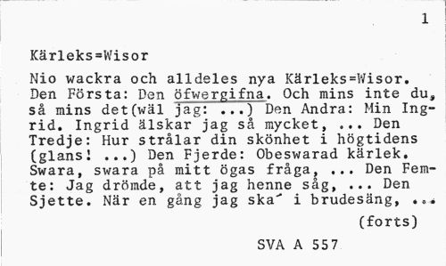 //// 1 //// Kärleks=Wisor //// Nio wackra och alldeles nya Kärleks=Wisor. Den Första: Den öfwergifna. Och mins inte du, så mins det(wäl jag: ...) Den Andra: Min Ingrid. Ingrid älskar jag så mycket, ... Den Tredje: Hur strålar din skönhet i högtidens (glansl ...) Den Fjerde: Obeswarad kärlek. Swara, swara på mitt ögas fråga, ... Den Femte: Jag drömde, att jag henne såg, ... Den Sjette. När en gång jag ska"* i brudesäng, «•« //// (forts) //// SVA A 55 7 ////