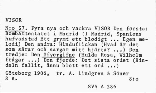 //// VISOR //// N:o 57. Fyra nya och vackra VISOR Den första: Bombattentatet i Madrid (I Madrid, Spaniens hufvudstad Ett grymt ett blodigt ... Egen melodi) Den andra: Hinduflickan (Hvad är det som sårar och sargar mitt hjärta? ...) Den tredje: Den öfvergifne (Hulda Rosa, Wilhelm frågar ...) Den fjerde: Det sista ordet (Bindeln fallit, ännu blott ett ord //// Göteborg 1906, tr. A. Lindgren & Söner 8 s. 8: o //// SVA A 286 ////