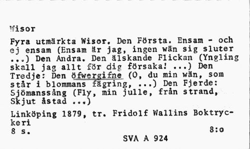 //// Wisor //// Fyra utmärkta Wisor. Den Första. Ensam - och ej ensam (Ensam är jag, ingen wän sig sluter ...) Den Andra. Den älskande Flickan (Yngling skall jag allt för dig försaka.1 ...) Den Tredjer Den öfwergifne (0, du min wän, som står i blommans fägring, ...) Den Fjerde: Sjömanssång (Fly, min julle, från strand, Skjut åstad ...) //// Linköping 1879, tr. Fridolf Wallins Boktryckeri //// 8 s. 8:o //// SVA A 924 ////