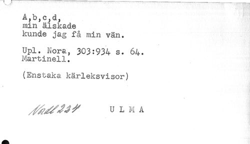 //// A,b,c,d, //// min älskade //// kunde jag få min vän. //// Upl. Kora, 303:934 s. 64. //// Martinell. //// (Enstaka kärleksvisor) //// t //// ^ U L M A //// 4 ////