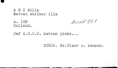 //// ABC dilla //// Katten skriker illa ; //// s. 199 //// Halland. //// f //// t //// Jmf A.B.C.D. katten pinka... //// ! //// * //// ! //// STRÖM. Sv.Visor o. ramsor. //// ! //// : //// ? //// } //// i //// < //// i //// i //// i //// i //// ! //// <11