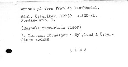 //// Annons på vers från en lanthandel. //// - * " * . //// Sdml. Österåker, 12739. s.320-21. //// Nordin-Grip, 1. //// (Enstaka ramsartade visor) //// A. Larsson försäljer i Nybylund i Öster- //// åkers socken ////