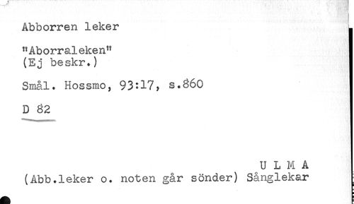 //// Abborren leker L //// "Aborraleken" j //// (Ej beskr.) ] //// Smål. Hossmo, 93:17, s.360 ! //// D 82 //// U L M A //// (Abb.leker o. noten går sönder) Sånglekar ////