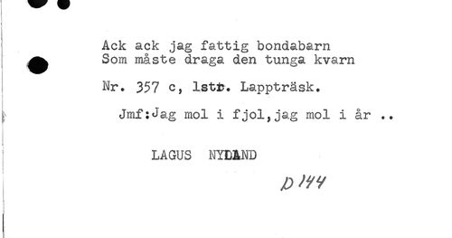 //// ^ Ack ack jag fattig bondabarn //// ^^ Som måste draga den tunga kvarn //// ! Nr. 357 c, Istt. Lappträsk. //// Jmf:Jag mol i fjol,jag mol i år .. //// LAGUS NYLAND //// j ////