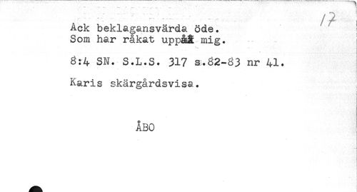 //// Ack beklagansvärda öde. ' ' //// Som har råkat uppåX mig. //// 8:4 SN. S.L.S. 317 s.82-83 nr 41. //// Karis skärgårdsvisa. //// ÅBO //// i ////