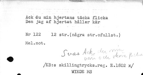 //// ^ - ^ ... r //// Ack du min hjertans täcka flicka //// Den jag af hjertat håller kär //// Nr 122 12 str.(några str.ofullst.) //// Mel.not. //// /KB:s skillingtrycks.reg. E.lg02 x/ //// WIEDE MS ////