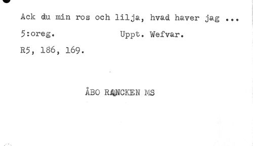 //// Ack du min ros och lilja, hvad haver jag ... //// 5:oreg. Uppt. Wefvar. //// R5, 1B6, 169. //// ÅBO ROCKEN NiS ////