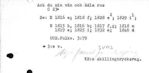 //// c 23+ //// Se: E 1816 e; 1818 f; 1826 e^; 1829 i^; //// N 1815 b, 1816 b; 1817 f,g; 1818 e //// 1819 a; 1825 i; 1832 a; 1846 d //// UUB.Folkv. 3:79 //// 3:e v. //// ^^ ' /t" / - ' " / " //// KB:s skillingtrycksreg. ////