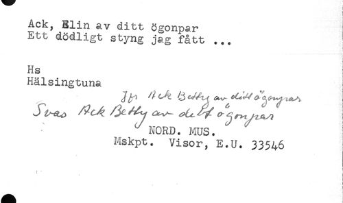 //// Ack, Elin av ditt ögonpar //// Ett dödligt styng jag fått ... //// t //// Hs - //// c //// Hålsingtuna //// NORD. MUS. ' //// Mskpt. Visor, E.U. 33546 //// 1 t //// * ////
