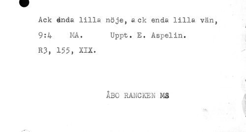 //// Ack ända lilla nöje, ack enda lilla vän, //// 9:4 MA. Uppt. E. Aspelin. //// R3, 155, XIX. //// f //// ÅBO RANCKEN Nig //// * * Sga //// ( //// ....., ////