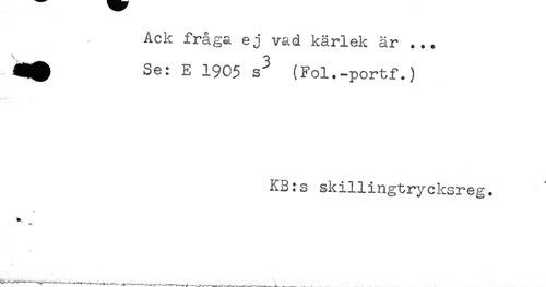 //// Ack fråga ej vad kärlek är ... //// Se: E 190$ s^ (Fol.-portf.) //// t, < * //// KB:s skillingtrycksreg. ////