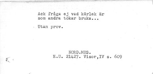 //// < //// Ack fråga ej vad kärlek är //// som andra tokar bruka... //// --= Utan prov. //// NORD.MUS. //// E.U. 21427. Visor,IV s. 609 //// t* //// ^ / ////