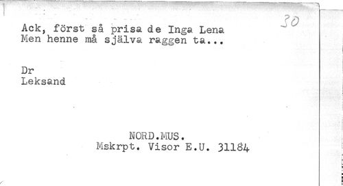 //// r -....... //// Ack, först så prisa de Inga Lena //// Men henne må själva raggen ta... //// Dr //// Leksand //// * //// t //// ! //// I //// r //// NORD. MUS. //// Mskrpt. Visor E.U. 31164 ^ //// 5 //// H //// g //// ^ 8 ////