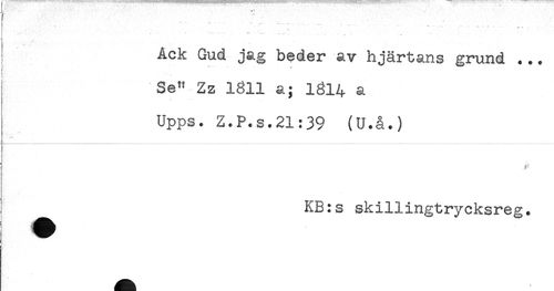 //// . , , . - , . - -- -f. //// . //// Ack Gud jag beder av hjärtans grund ... //// < //// Se" Zz 1811 a; 1814 a //// Upps. Z.P.s.21:39 (U.å.) //// ^^ KB:s skillingtrycksreg. ////