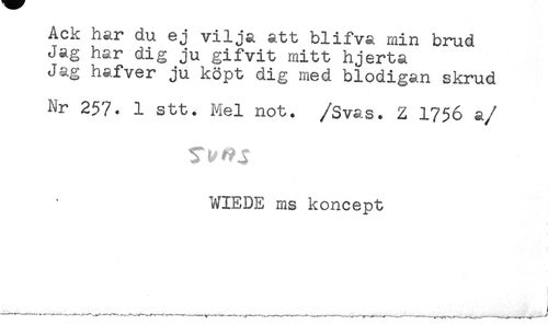 //// ACK har du ej vilja att blifva min brud //// Jag har dig ju gifvit mitt hjerta //// Jag hafver ju köpt dig med blodigan skrud //// Hr 257. 1 stt. Mel not. /Svas. Z 1756 a/ //// WIEDE ms koncept ////