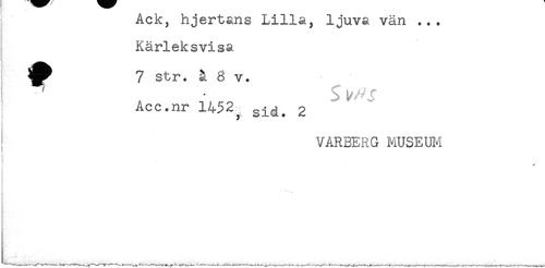 //// , ----y - ^ -- - - - - - - //// Kärleksvisa //// V 7 str. & 8 v. //// Acc.nr 1452^ g^d. 2 //// VARBERG MUSEUI^I //// j ////