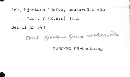 //// Ack, hjertans ljufva, sockersöta vän //// - Maal. ? (E.A:n) 33.4 ' //// Del II nr 593 //// RANCKEN Förteckning ! //// i //// t //// i //// i ////