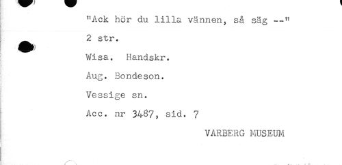 //// "Ack hör du lilla vännen, så säg --" //// - //// 2 str. //// Wisa. Handskr. //// Aug. Bondeson. //// Vessige sn. //// Acc. nr 3437, sid. 7 //// VARBERG MUSEUM ////