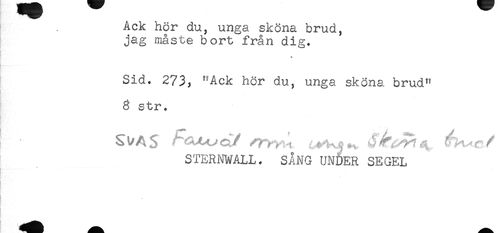 //// ! . Ack hör du, unga sköna brud, //// jag måste bort från dig. //// [! - //// T //// Sid. 273, "Ack hör du, unga sköna brud" //// 3 str. //// STER1WALL. SANG UNÖER SEGEL ////