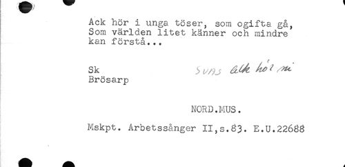//// Ack hör i unga töser, som ogifta gå, //// Som världen litet känner och mindre //// kan förstå... //// Sk ^^ ^ ^ //// Brösarp //// NORD.MUS. //// r //// Mskpt. Arbetssånger II,s.33. E.U.22688 ////