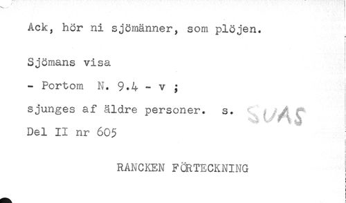 //// Ack, hör ni sjömänner^ som plöjen. //// r //// .. //// Sjömans visa //// - Portom N. 9.4 - v ; //// sjunges af äldre personer, s. ^ ^ f //// Del II nr 605 //// ! //// t //// ! //// ) //// ! //// i //// RANCKEN F(BTECKNING //// . //// < ////