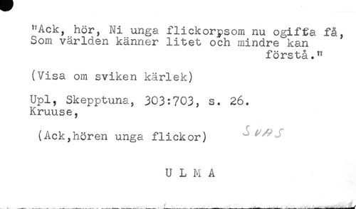 //// "Ack, hör, Ni unga flickorpsom nu ogifSa få, //// Som världen känner litet och mindre kan //// förstå." //// (Visa om sviken kärlek) //// Upl, Skepptuna, 303:703, s. 26. //// Kruuse, //// (Ack,hören unga flickor) ' ^ ////