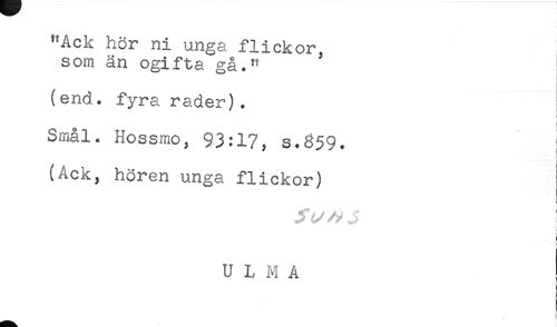//// "Ack hör ni unga flickor, //// som än ogifta gå." //// (end. fyra rader). //// < //// i //// Smål. Hossmo, 93:17, s.859. //// (Ack, hören unga flickor) //// ! //// : //// U L M A //// * //// * ////